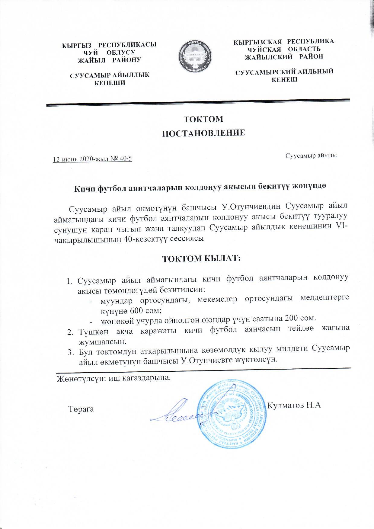 Кичи футбол аянтчаларын колдонуу акысын бекитүү жөнүндө 12-июнь 2020-жылдагы №40/5 токтому
