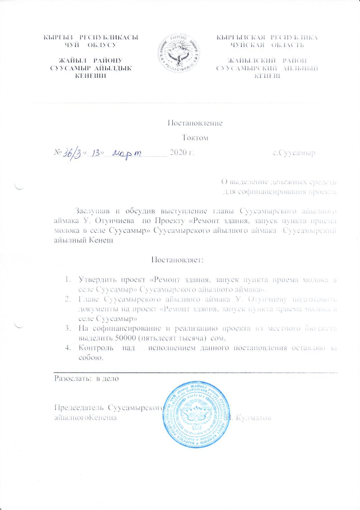 Постановление о выделение денежных средств для софинансирования проекта 13.03.2020г №36/4