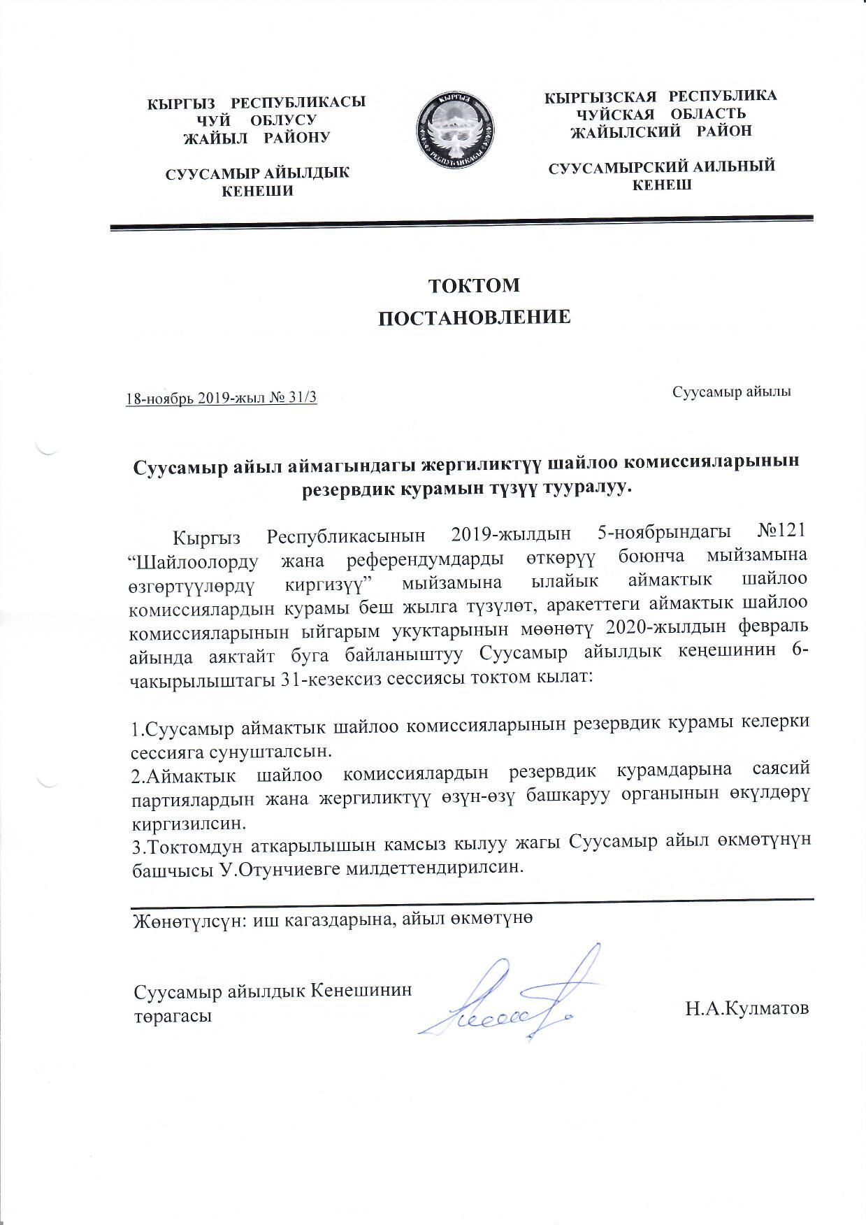 Суусамыр айыл аймагындагы жергиликтүү шайлоо комиссияларынын резервдик курамын түзүү тууралуу 18.11.2019-ж. №31/3