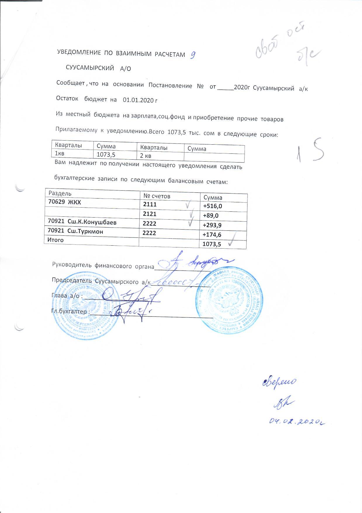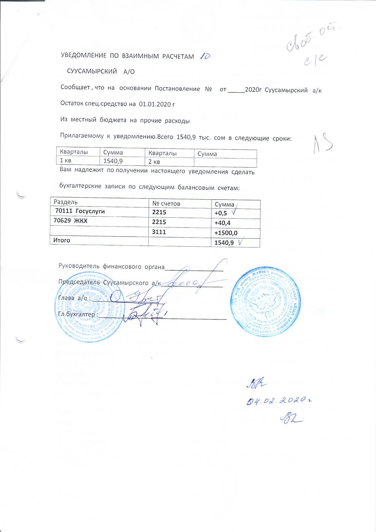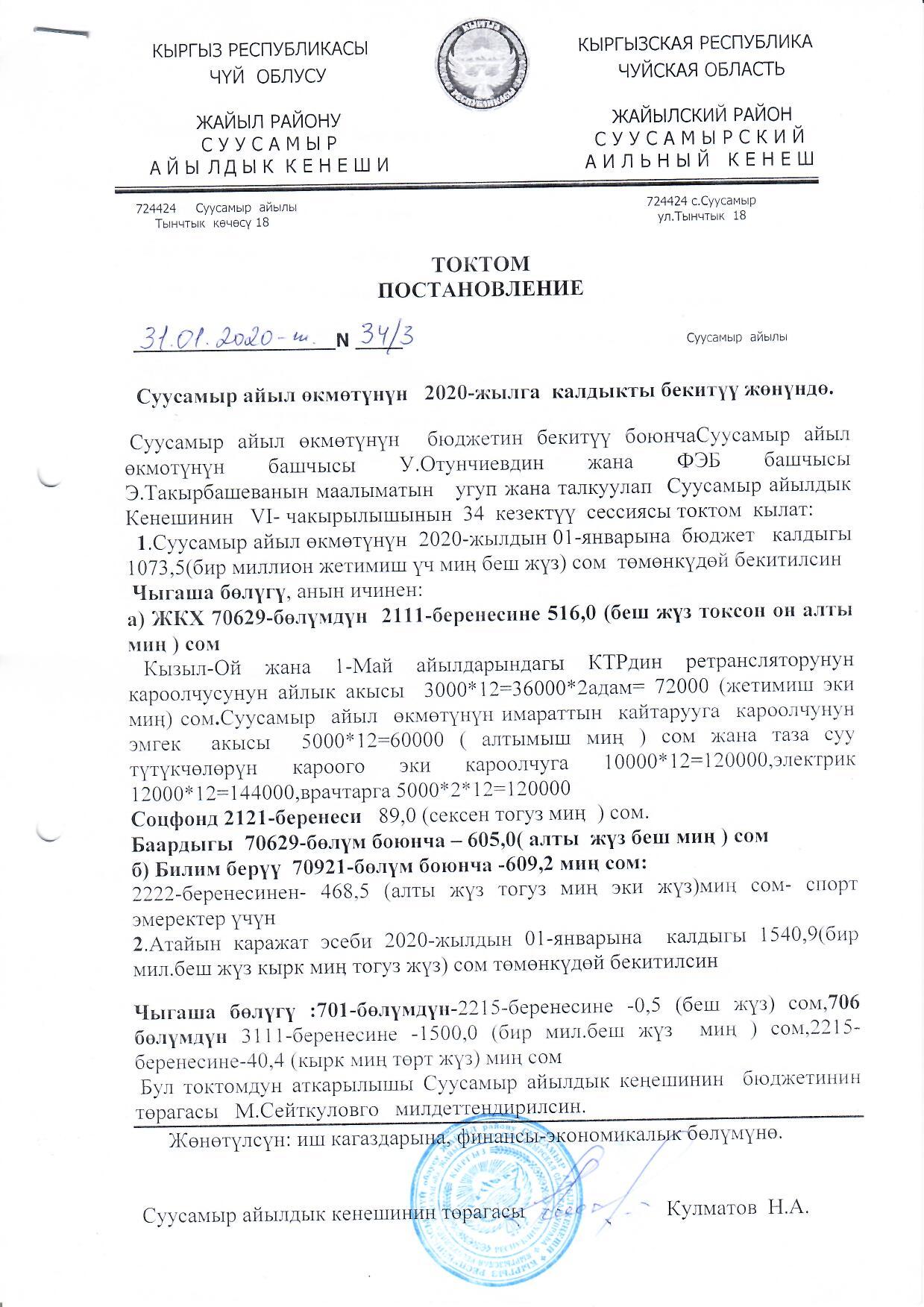 Суусамыр айыл өкмөтүнүн 2019-жылдагы бюджетинин калдыгын бекитүү жөнүндө 31.01.2020-жыл №34/3 токтому