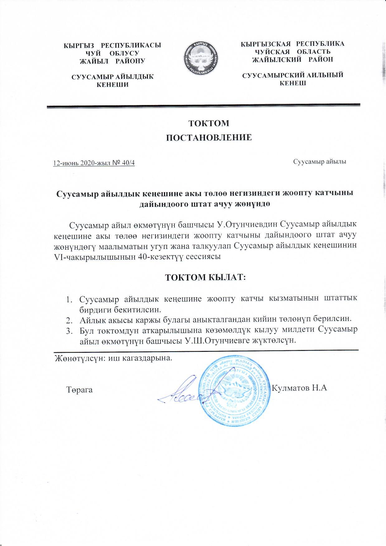 Суусамыр айылдык кеңешине акы төлөө негизиндеги жоопту катчыны дайындоого штат ачуу жөнүндө 12-июнь 2020-жылдагы №40/4 токтому