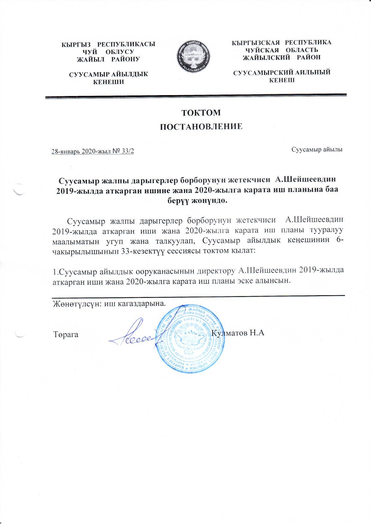 Суусамыр ЖДБнун жетекчиси А.Дж.Шейшеевдин 2019-жылда аткарган ишине жана 2020-жылга карата иш планына баа берүү жөнүндө 28.01.2020-жыл №33/2 токтому