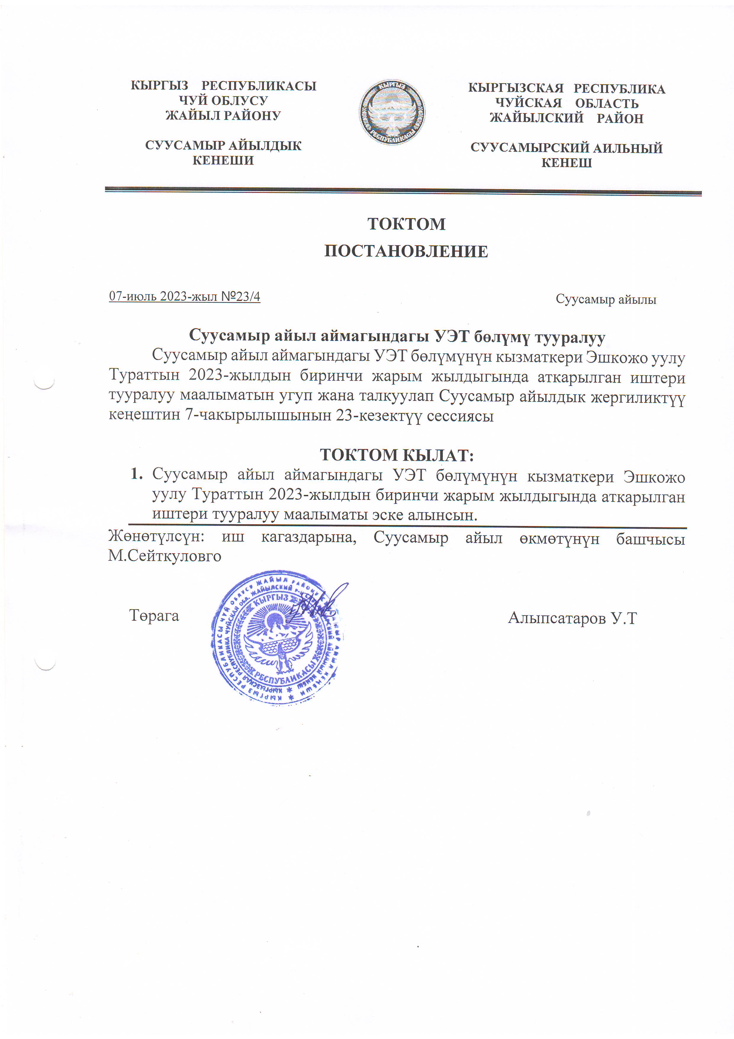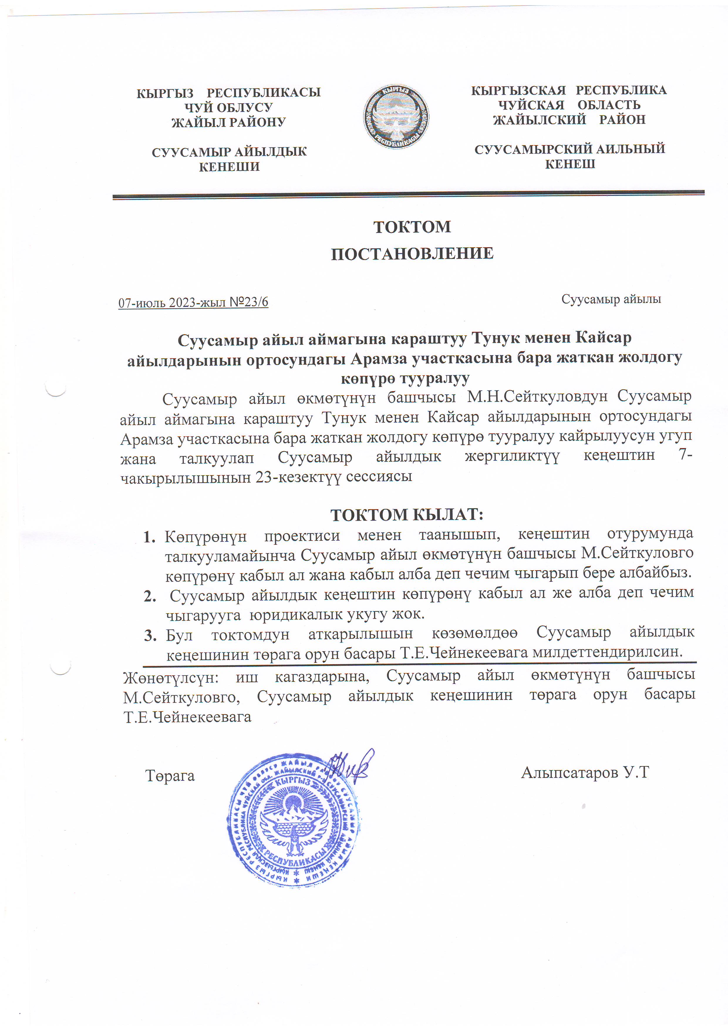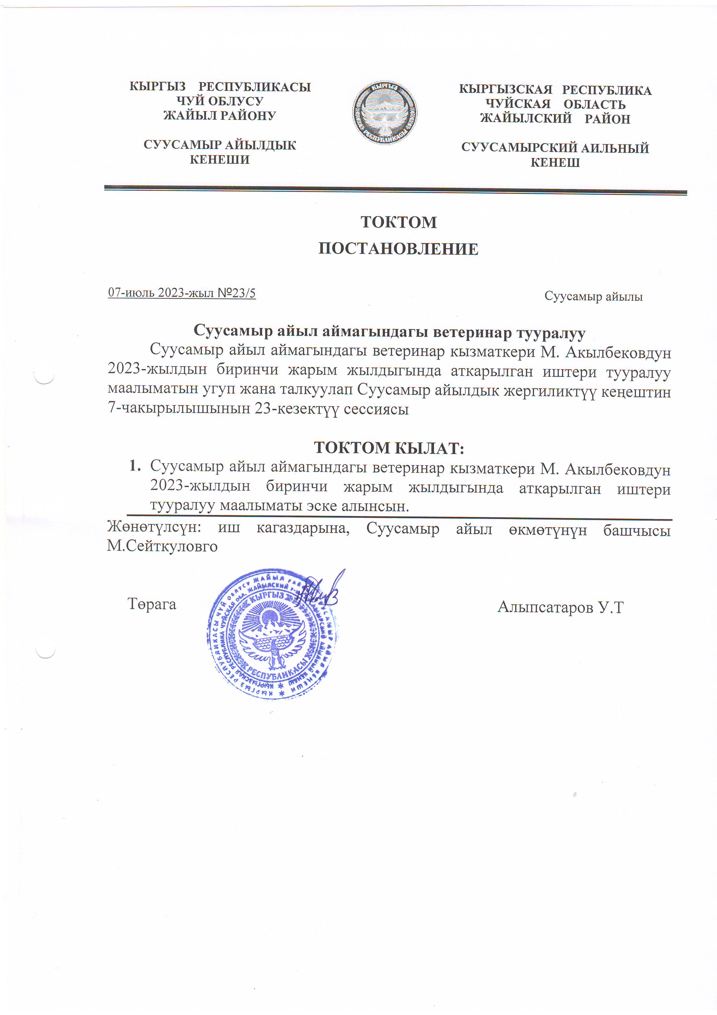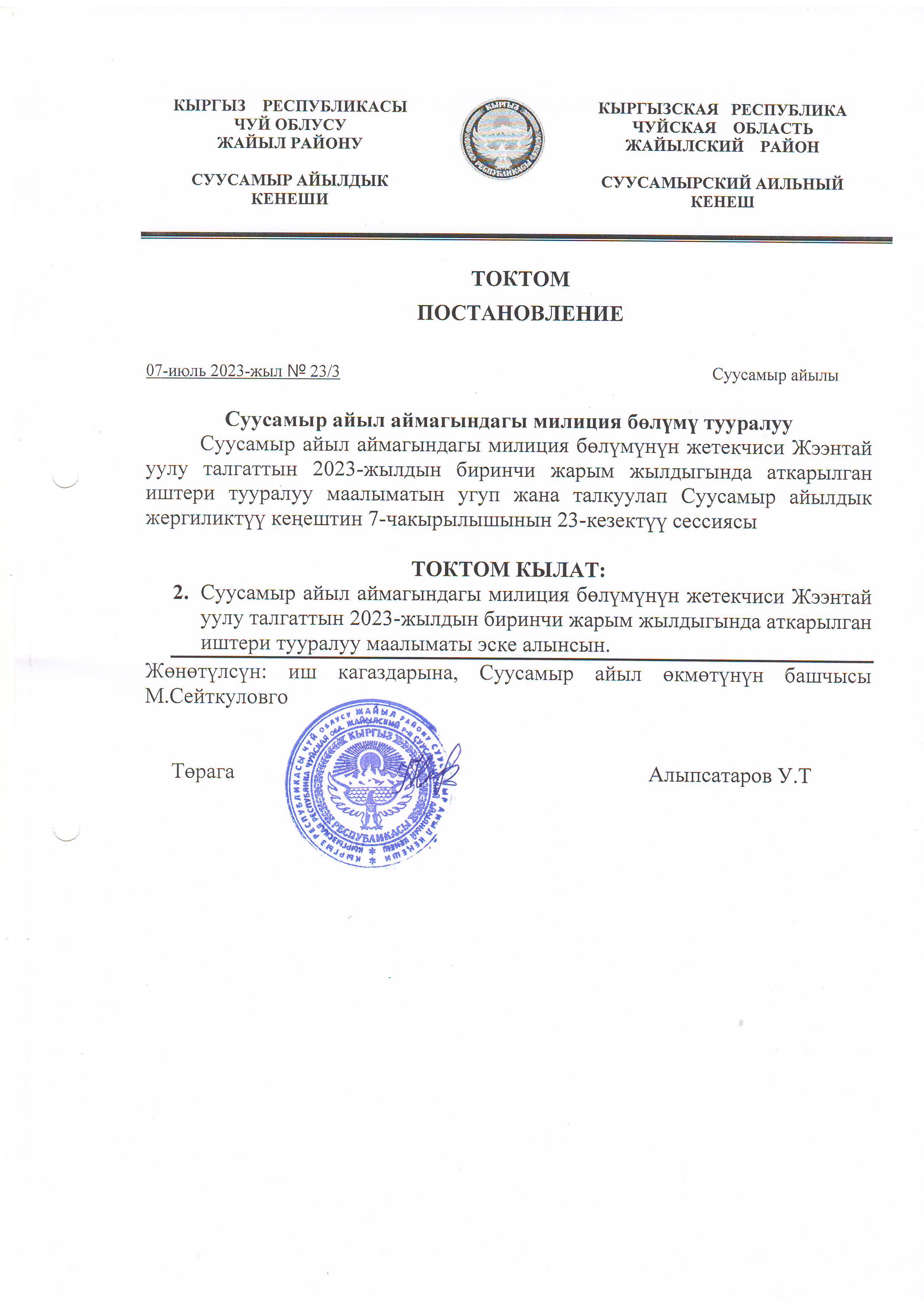 Жергиликтүү кеңештин 07-июль 2023-жыл токтомдору
